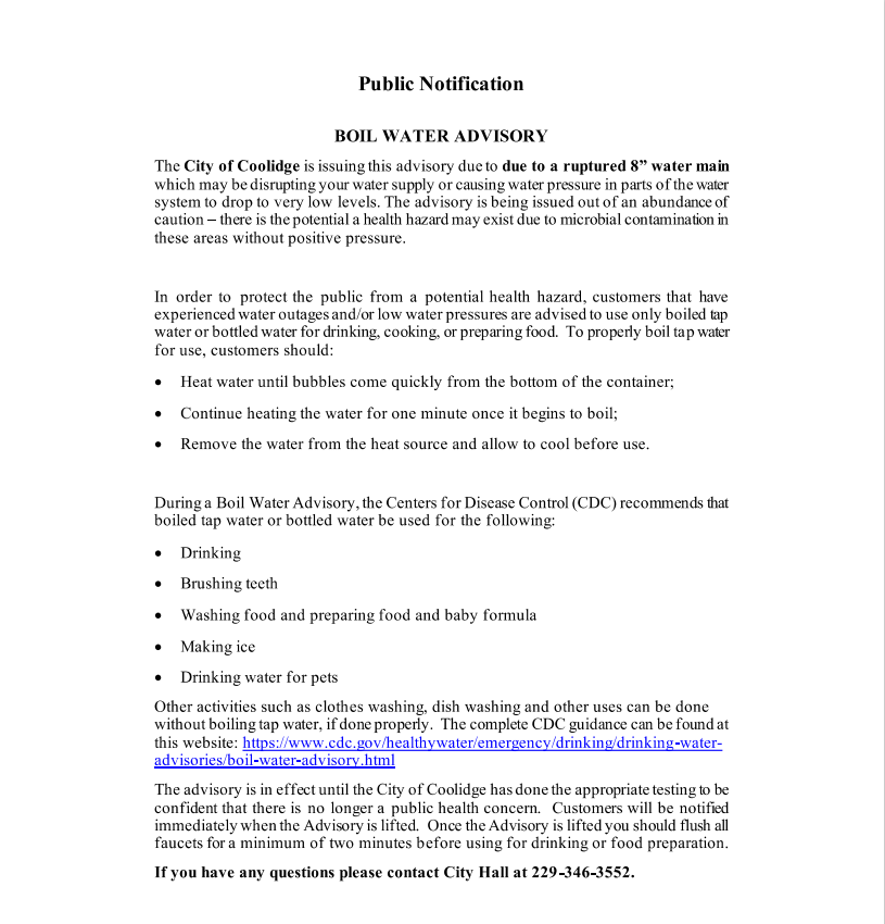 CITY OF COOLIDGE BOIL WATER ADVISORY